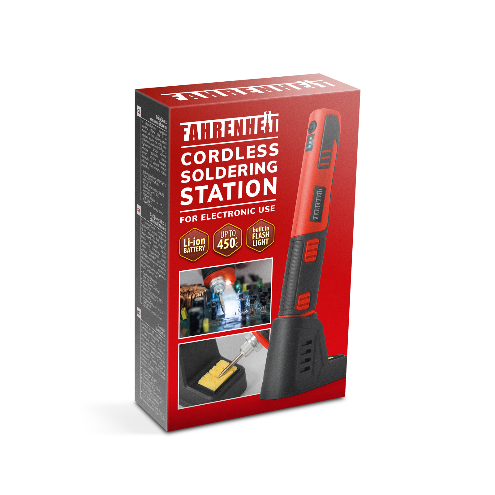 Aparatul de lipit alimentat cu acumulatori va permite sa lipiti in locuri in care nu exista o sursa de alimentare externa. Incarcarea este rapida datorita conectorului modern USB Type-C. Poate fi alimentat de la orice dispozitiv USB extern (adaptor de alimentare, powerbank, laptop, alte dispozitive). Designul sau ergonomic asigura o utilizare confortabila. Suportul asigura o depozitare si o racire sigura. Buretele inclus permite curatarea usoara a varfului. Model cu acumulatoriIncarcare rapidaLampa de lucru cu LED-uriPort standard Type-C in partea superioaraUsor, rapid si poate fi folosit oriundeTimp scurt de incalzireIncarcare si indicator de incarcare LEDDeconectare automata dupa 10 minuteCu burete de curatare Temperatura de lipire:max. 450°C +-5°CTimp de incalzire:~25 mpPerformanta:8 WSursa de energie:AkkumulatorCapacitatea si tip acumulator:18650 Li-Ion, 4 V, nu este interschimbabil, 1500 mAhSursa de alimentare a rack-ului:5V - 2A, USB Type-CLungimea cablului Type-C:50 cmLungimea unui pichet (fara varf)S180 mmSectiune transversala:35 x 28 mmCuloare:Rosu / negruMaterial tampon:Plastic, cauciucGreutatea:~130 gDimensiunea suportului:90 x 48 x 65 mmCuloare suport tampon:NegruMaterial suport de tampon:Metal, plasticGreutatea suportului :~135 gDimensiunea buretelui:25 x 18 x 5 mm