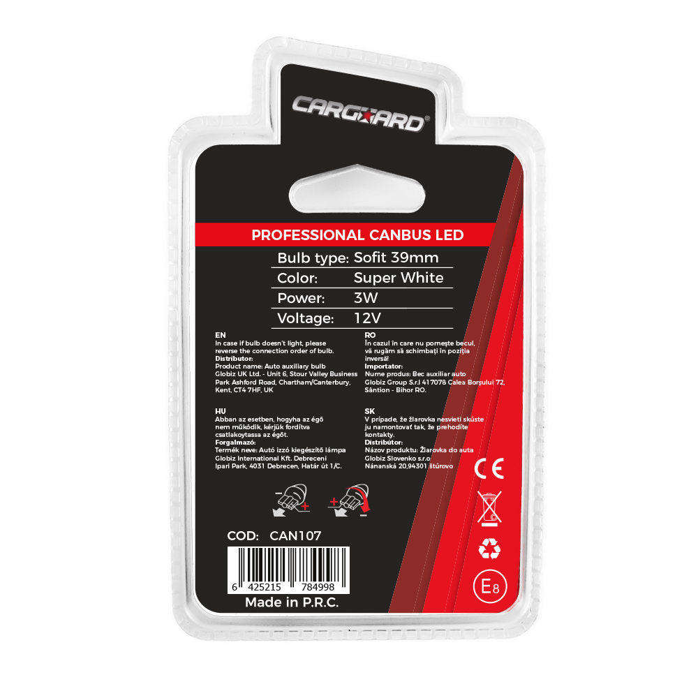 Led Sofit (plafoniera. numar de inmatriculare)   CAN107         Lumeni:   72                              Tipodimensiune:   Sofit: 39mm                              Normal / Canbus:   CAN-Bus                              Tip LED:   SMD                              Tensiune:   12V                              Putere:   3 W      A se utiliza in afara drumurilor publice.Atentie: Pret /set de 2 buc !