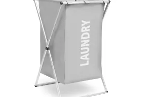 Cos de rufe din material textil cu aspect modern. Datorita cadrului metalic solid si capacitatii mari, poate depozita pana la cateva kilograme de haine.Clapetele pliabile de transport il fac usor de tranasportat.Cu maner si buzunar lateral Dimensiune: 37,5 x 38 x 57 cm Numar de compartimente: 1 mare + 1 buzunar lateral Capacitate maxima: 55 L Material: Textil/aluminiu Culoare: Gri Curatare: Cu o carpa umeda