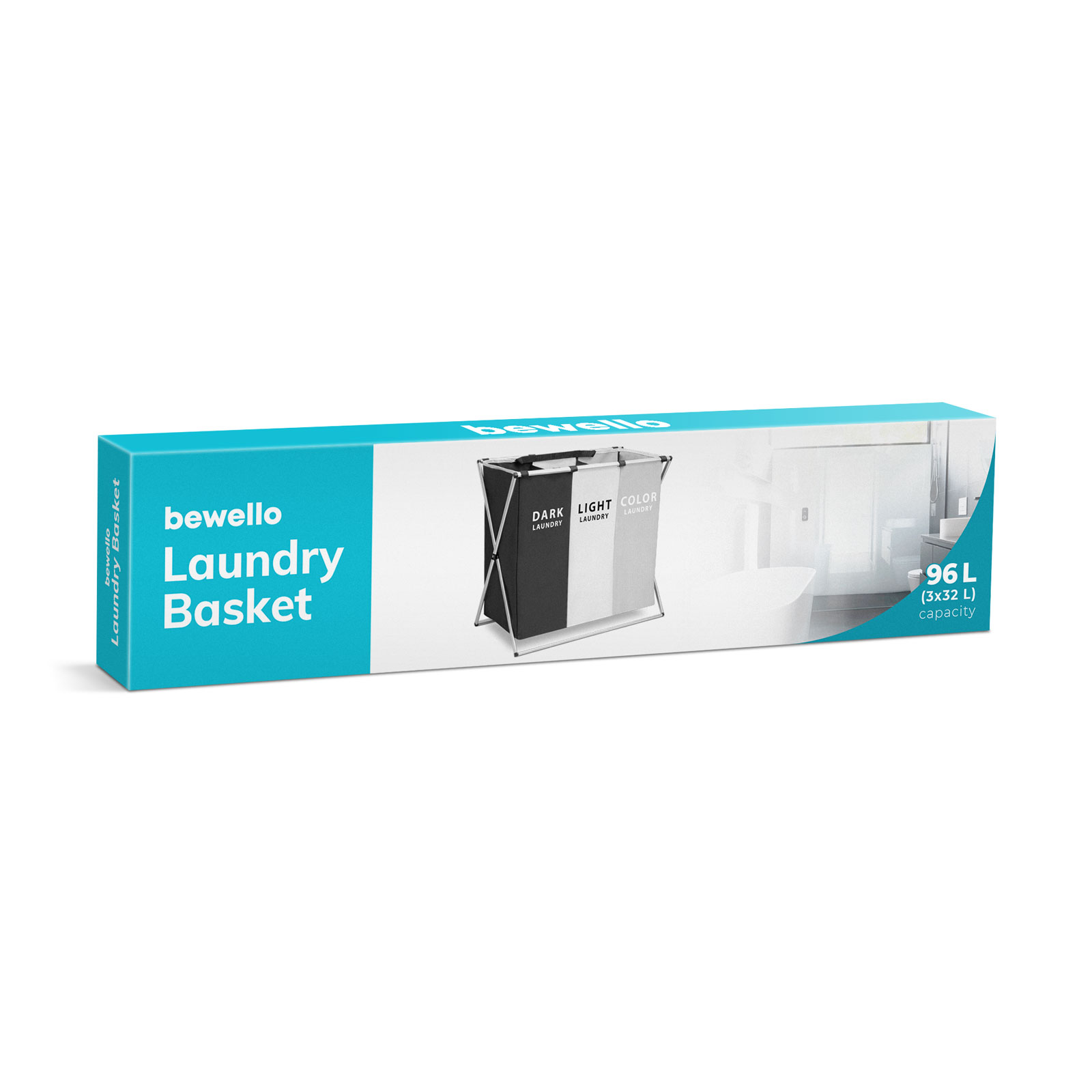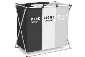 Cos de rufe din material textil cu aspect modern, cu mai multe compartimente.Datorita cadrului metalic, solid si capacitatii mari, poate depozita pana la cateva kilograme de haine si lenjerie de pat.Compartimentele iti permit sa separi hainele de diferite culori.Clapetele pliabile garanteaza o portabilitate usoara.Cadru metalic puternic Cu maner Cu buzunar lateral Dimensiune: 65 x 37 x 58 cm Numar de compartimente: 3 buzunare mari + 3 laterale Capacitate maxima: 96 l Material: textil / aluminiu Culoare: gri/negru/alb Curatare: cu o carpa umeda