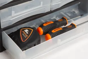 Puteti lucra eficient numai in conditii ordonate! Cu ajutorul acestui organizator portabil, puteti pastra separate pe marimi si tip piese mici, suruburi, dibluri, cuie, intrerupatoare sau alte componente electronice necesare pentru lucrari. Datorita elementelor de divizare, puteti separa pana la 24 de tipuri de accesorii. Sertarele transparente si detasabile ofera o vizibilitate buna.   11 sertare extractabile si amovibile (1 mare, 2 medii, 8 mici)   8 buc. elemente de divizare   Sertarele pot fi prevazute cu etichete   Compartimente fixe pe partea superioara   Maner camuflat   Material puternic, rezistentNumar sertare:          11 buc.Numar compartimente:          24 buc.Dimensiune sertare:  Mare: 280 x 130 x 55 mmMediu: 140 x 130 x 55 mm130 x 70 x 50 mmMaterial:       Material plasticCuloare:        Negru/Portocaliu