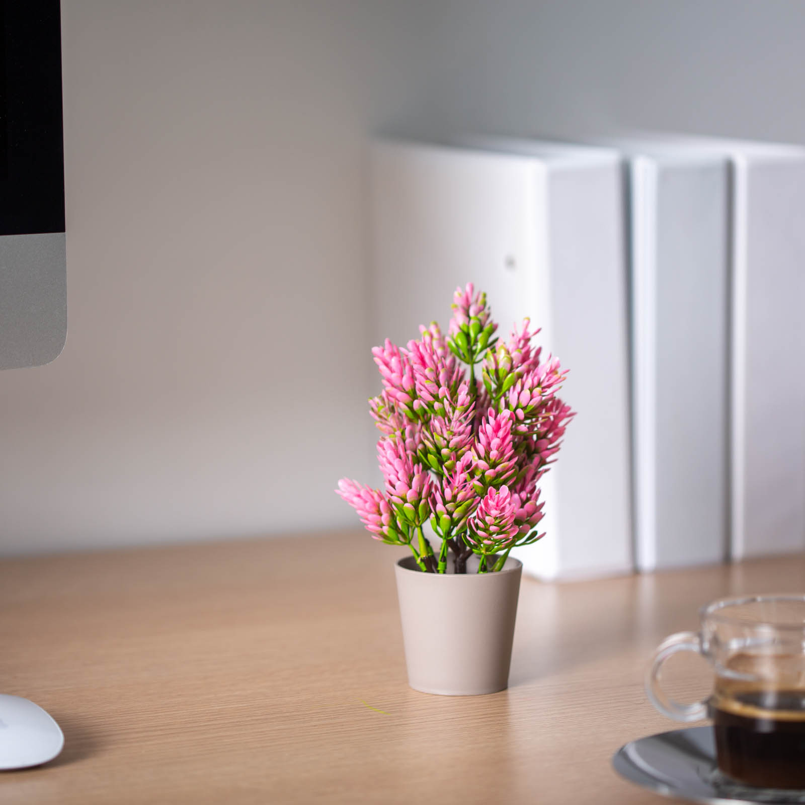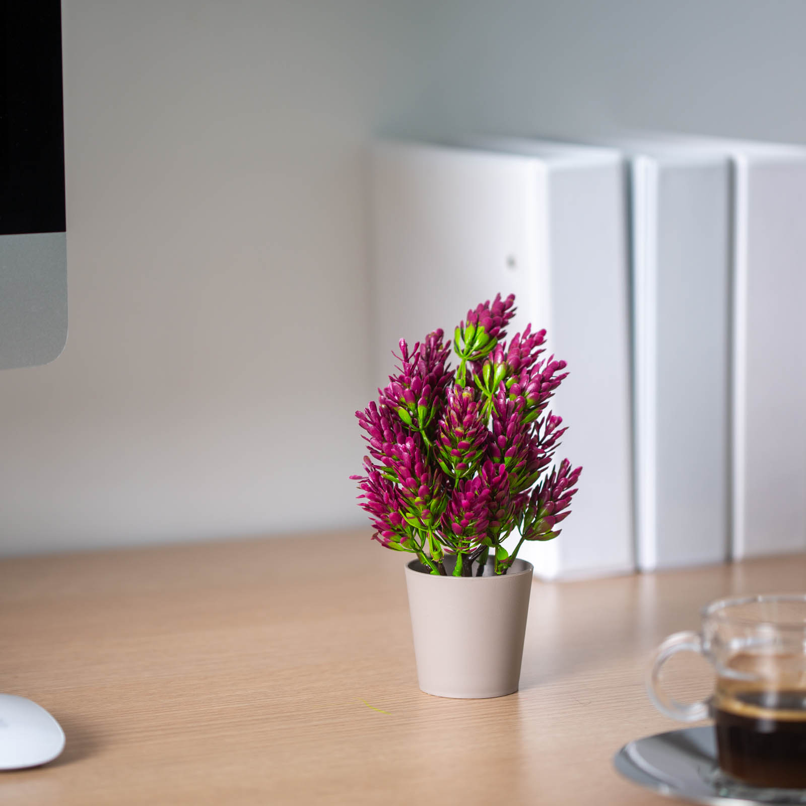 Descoperiti simplitatea de a va decora casa, biroul sau spatiul comunitar cu aceasta planta artificiala magica, decorativa!O planta artificiala eleganta, cu aspect elegant, culoarea sa realista si detaliile bogate vor da viata oricarui spatiu. Aceasta planta ornamentala va adauga instantaneu prospetime si naturalete mediului inconjurator, in timp ce se imbina perfect cu interioarele minimaliste, moderne sau chiar traditionale.Plantele artificiale pot fi o alegere ideala pentru orice mediu, deoarece nu numai ca ofera un aspect estetic, dar au si un efect pozitiv asupra starii de spirit. Mediul calm si armonios creat de plantele verzi ajuta la reducerea stresului si la imbunatatirea bunastarii generale. In acelasi timp, poate fi folosit si pentru a decora spatii cu putina lumina in care este ingreunata cresterea plantelor vii.Disponibil in 4 culoriFara intretinereCulori fideleDetalii bogateAspect vesel Dimensiune:O12 x 18 cmMaterial:PlasticCuloare:Roz, albastru deschis, visiniu, galbenÂ