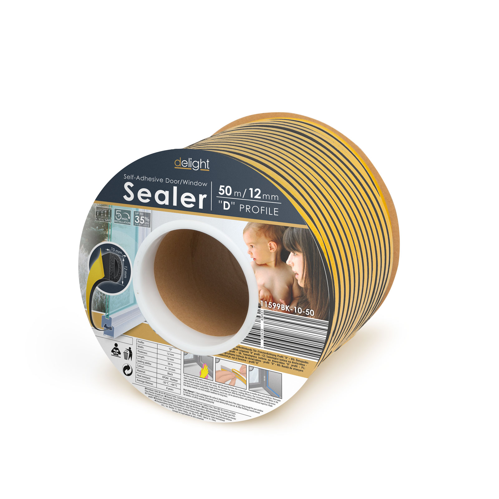 Delight - Profil de etansare autoadeziv pt. ferestre, profil „D” - 50 m, Negru, 10 mm