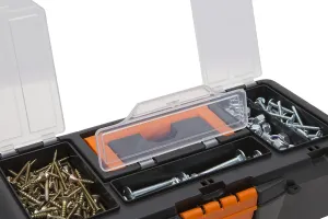 Usor de organizat. Sub capacul transparent, vei gasi un sertar cu 3 compartimente individuale, utile stocarii obiectelor mai mici si usor de pierdut. Compartimentele sunt pe diferite dimensiuni, fiecare sectiune avand un capac transparent separat. Astfel, vei deschide doar partea care te intereseaza. Datorita peretilor despartitori, piesele vor sta la locul lor, indiferent ca sunt unelte de pescuit, margele pentru DIY-uri sau alte accesorii (suruburi, cuie, etc.);