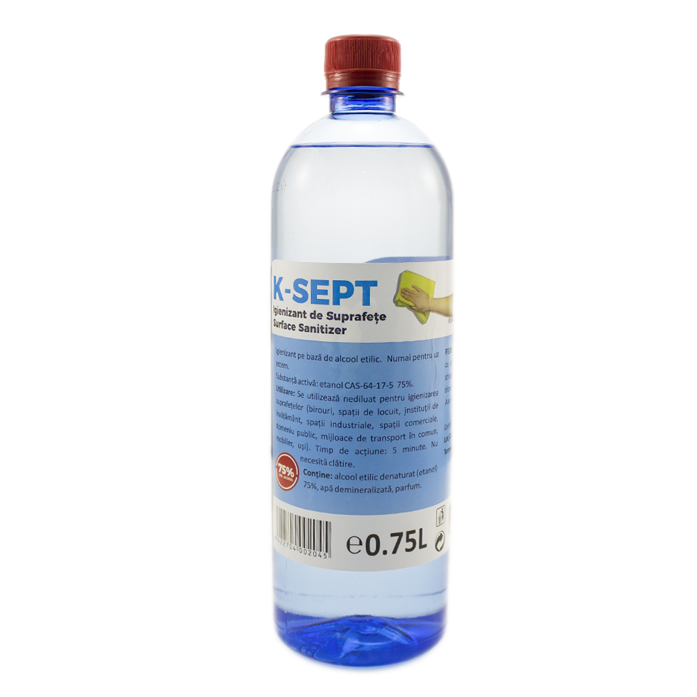 K-SEPT - Solutie igienizanta pentru suprafete (Surface Sanitizer)Igienizant pe baza de alcool etilic - numai pentru uz extern.Substanta activa: etanol CAS-64-17-5 75%.Utilizare: Se utilizeaza nediluat pentru igienizarea suprafetelor (birouri, spatii de locuit, institutii deinvatamant, spatii industriale, spatii comerciale, domeniu public, mijloace de transport in comunmobilier, usi).Timp de actiune: 5 minute. Nu necesita clatire.Compozitie: alcool etilic denaturat (etanol) 75%, apa demineralizata, parfumContinut: 750 ml