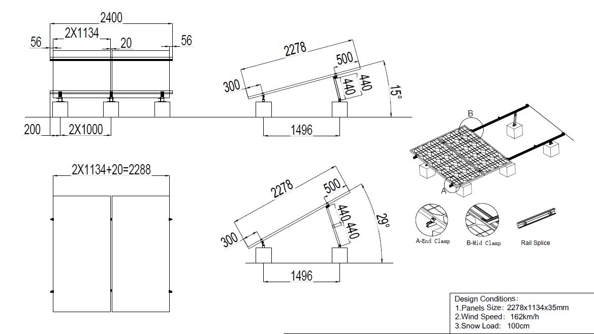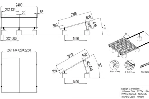 Kit complet 2 panouri asezare Portret - ReglabilSpecial pt panouri de 540W - 2278 x 1134 x 35mm/ panouRezistenta la vant 162km/hRezistenta la zapada 100 cmUnghi reglabil 15-30°Continut Pachet: Sina 240cm : 2 bucClema capat: 4 bucClema Dubla : 2 bucPicior adjustabil - Frontal : 3 bucPicior adjustabil - Spate 440mm: 3 bucSurub : 12 bucElemente de impamantare: 2 bucATENTIE : pretul nu contine contragreutatiileÂ