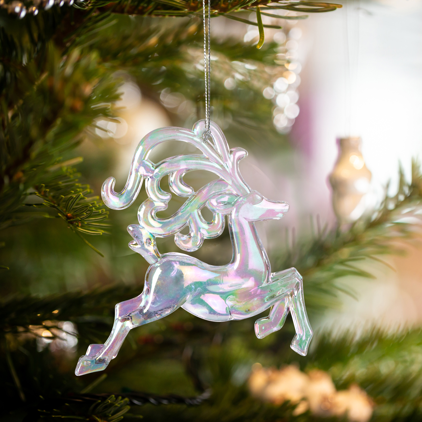 Acest ornament de Craciun este un ren cu efect deosebit, irizat, care va impodobi elegant bradul sau orice alt aranjament festiv. Ornamentul acrilic este usor, dar durabil, astfel incat poate fi reutilizat an de an. Datorita efectului irizat, culorile ornamentului se schimba in functie de umbre si lumina. Datorita aspectului sau elegant, acest decor de Craciun poate fi si un cadou excelent pentru cei dragi sau prieteni.