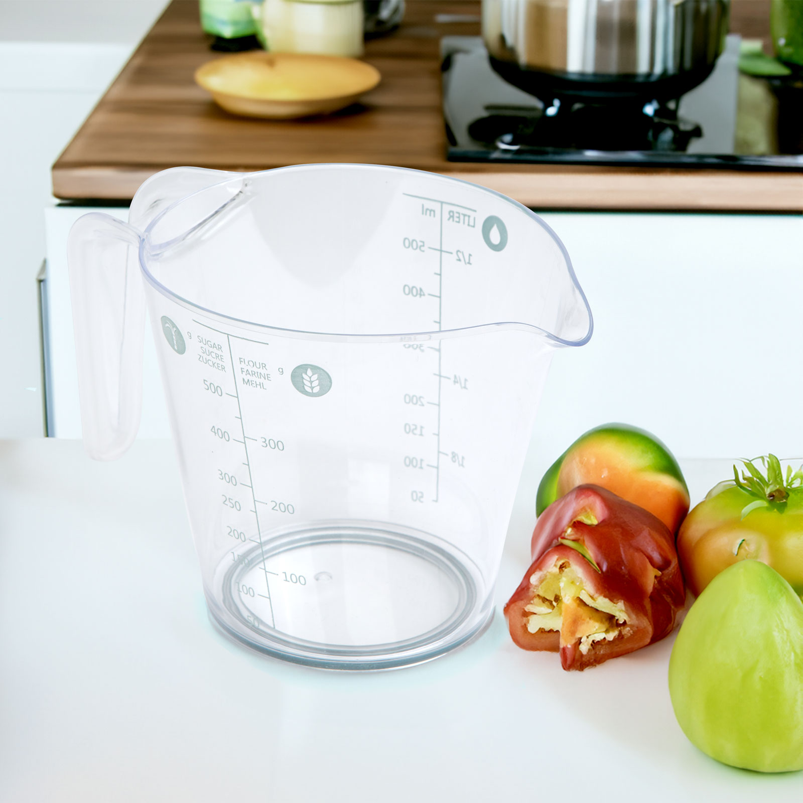 Un pahar de masura, pe care Il  poti folosi pentru a urmari cu exactitate retetele. Potrivit pentru masurarea a maxim 500 ml lichid, 500 g zahar sau 300 g faina.Perete transparentCu gura de scurgereManer pentru o prindere siguraFund cauciucat, antiderapant Marimea:16 x 9,7 x 11 cmCapacitate:Max. 500 mlMaterial:PlasticCuloare:TransparentFara BPA:daSe potriveste masina de spalat vase:daGreutate:~73 g