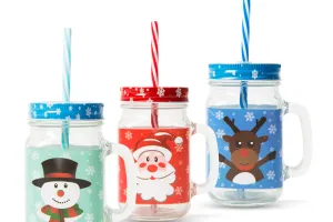 Pahar de sticla cu modele de Craciun: Mos Craciun, om de zapada, ren. Ideale pentru un ceai in zilele friguroase de iarna.