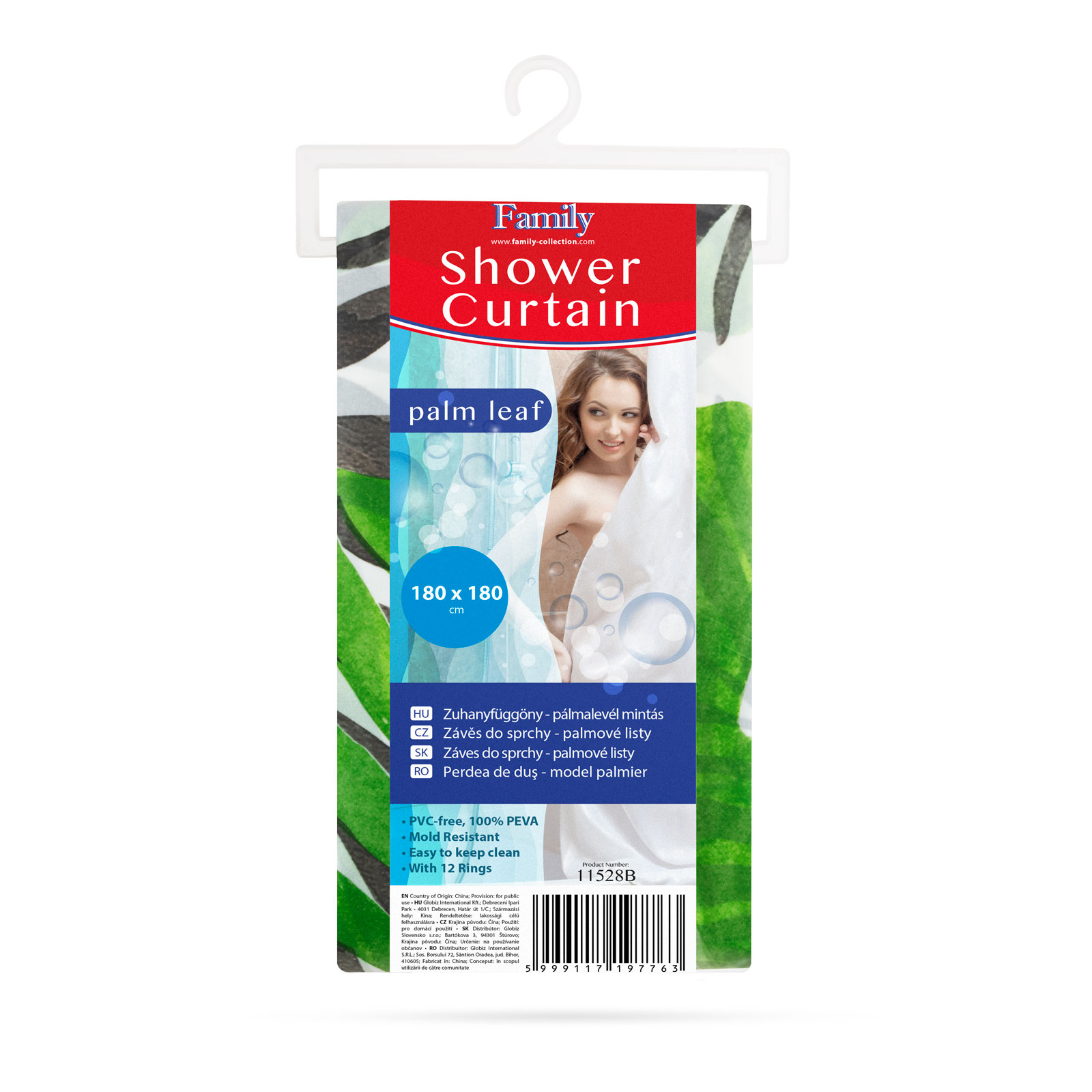 Perdeaua de dus este un accesoriu esential in orice baie.Cu aceasta perdea din frunze de palmier cu siguranta atmosfera oricarei bai se va inveseli.Este usor de utilizat: doar agatati inelele in gauri si fixati-le de tija perdelei de dus.Semi-transparent / verde-gri Model de frunze de palmier Perdea mare Usor de curatat Cu 12 inele pentru suspendare Dimensiune: 180 x 180 cm Material: 100% PEVA (acetat de polietilena de vinil) Grosimea materialului: 0,08 mm Greutate: 442 g