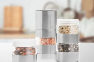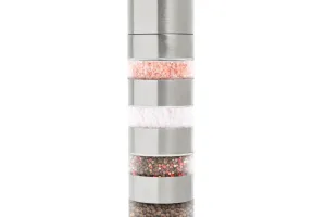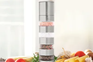 Rasnita de condimente din otel inoxidabil cu 4 compartimente de depozitare. Ordinea compartimentelor poate fi schimbata, astfel incat sa ai mereu la indemana condimentul de care ai nevoie. Finetea macinarii poate fi reglata cu o rola, in functie de calitatea de care ai nevoie.