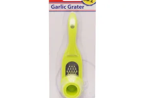 Accesoriu de bucatarie practic. Cu ajutorul dispozitivului se razuie usturoiul cu usurinta si fara pericolul de raniri.Se poate agata de la maner+l de plastic, suprafata de lucru fiind din otel inox.