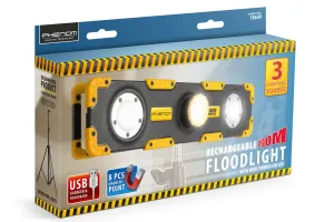 Noul produs de calitate al familiei de produse Phenom, care este de nelipsit din orice atelier, santier, sau gospodarie. COB LED-ul de mare putere (15 W ~1200 lm) lumineaza ore in sir, oferind o iluminare generoasa a spatiului de lucru. Priza USB de 5 V incorporata asigura alimentarea ideala pentru reincarcarea telefonului. Lampa poate fi transportata si fixata cu un maner pliabil cu magneti.3 moduri de iluminare, fiecare cu intensitate reglabila:   2 buc. COB LED (400+400 lm)   1 buc. COB LED focalizabil (400 lm)   2 buc. COB LED + COB LED cu focalizare simultan (400+400+400 lm)   Intensitate luminoasa reglabila   Lumina centrala focalizabila   Picioruse de sustinere si suport rotativ 120° tip carlig   Sir LED pentru semnalizarea starii de incarcare a acumulatorului   Colturi protejate prin garnituri de cauciuc   8 magnetiATENTIE: Trepiedul (cod 18649B) vizibil in imaginile de prezentare NU este inclus in pretul reflectorului si se achizitioneaza separat.   Sursa de lumina:     COB LED + SMD LEDPutere:                15 WIntensitate luminoasa:1200 lumeniDurata de viata a LED-ului:25000 oreTemperatura de culoare LED:6500 °KAlimentare:    Acumulator Li-Ion incorporat 2 x 2000 mAhInterval reglare intensitate luminoasa:25 - 50 - 75 - 100%Durata de incarcare   5,5 oreNr. cicluri de incarcare:   500 cicluriLungimea cablului USB:100 cmIndice de protectie:IP33Dimensiuni: 330 x 80 x 60 mmMasa: 456 gÂ