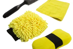 Igrijirea masinii, motocicletei, sau ambarcatiunii tale sunt importante pentru tine? Unul dintre accesoriile be baza pentru ingrijirea lor il reprezinta peria si buretele cu care faci curatirea. Acestea pot sa ajute la pastrarea aspectului impecabil, sau din contra, sa deterioreze.De aceea un set de curatare cu microfibre este perfect. Acesta curata perfect suprafetele, fara a zgaria sau matui vopseaua. Suprafata moale, din microfibra, cu capacitate de absorbtie foarte buna.Indeparteaza impuritatile in mod delicat. Utilizati apa din abundenta si sampon in cursul curatirii. Ideal in gospodarie si la cosmetica autoUsor si confortabil de folosit Utilizabil cu apa caldaMultiple utilizariAi mai multe accesorii intr-un singur pachet pentru a avea acces la toate suprafetele, oricat ar fi de dificil de accesat.Setul contine: Laveta microfibra - 40 x 40 cm 250gr/m2Manusi cu microfibra - 25 x 18 cmBurete cu microfibra - 23 x 12 x 5.5cmPerie pentru jante : 27 cm