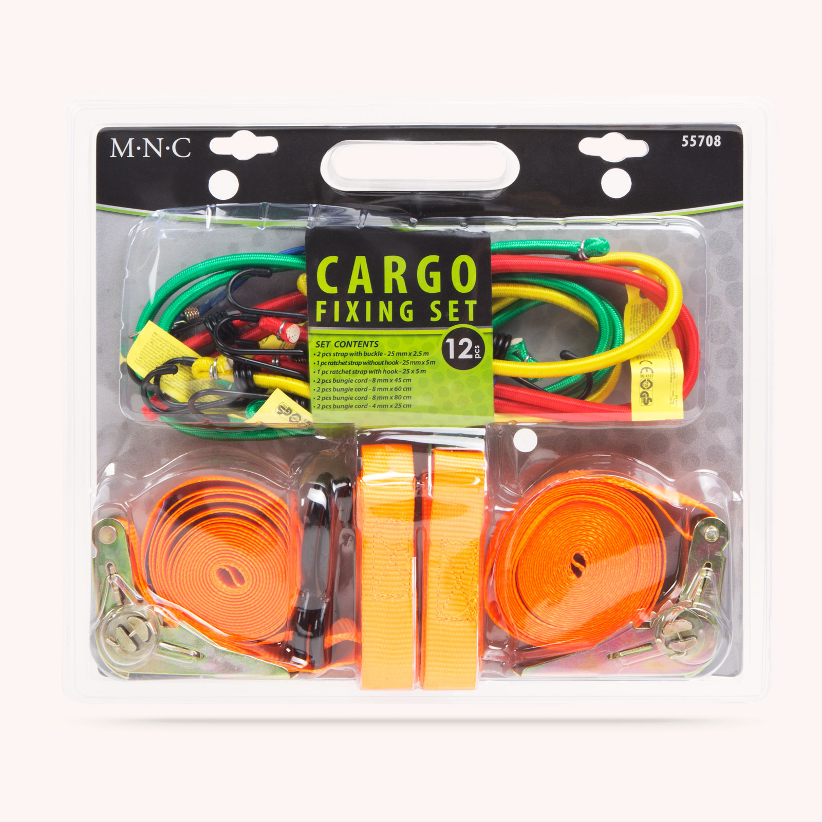 Legea circulatiei prevede fixarea solida a incarcaturii vehiculelor. Acest set de fixare ofera fixarea sigura a oricarei incarcaturi.Fixare stabilaUtilizare simpla si comoda Continutul setului:  2 chingi cu catarama - 25 mm x 2,5 m (max. 250 kg)1 chinga cu clichet fara carlig - 25 mm x 5 m (max. 500 kg)1 chinga cu clichet si carlig - 25 x 5 m (max. 450 kg)2 cordeline elastice - 8 mm x 45 cm2 cordeline elastice - 8 mm x 60 cm2 cordeline elastice - 8 mm x 80 cm2 cordeline elastice - 4 mm x 25 cmMaterial:      Material plastic PE