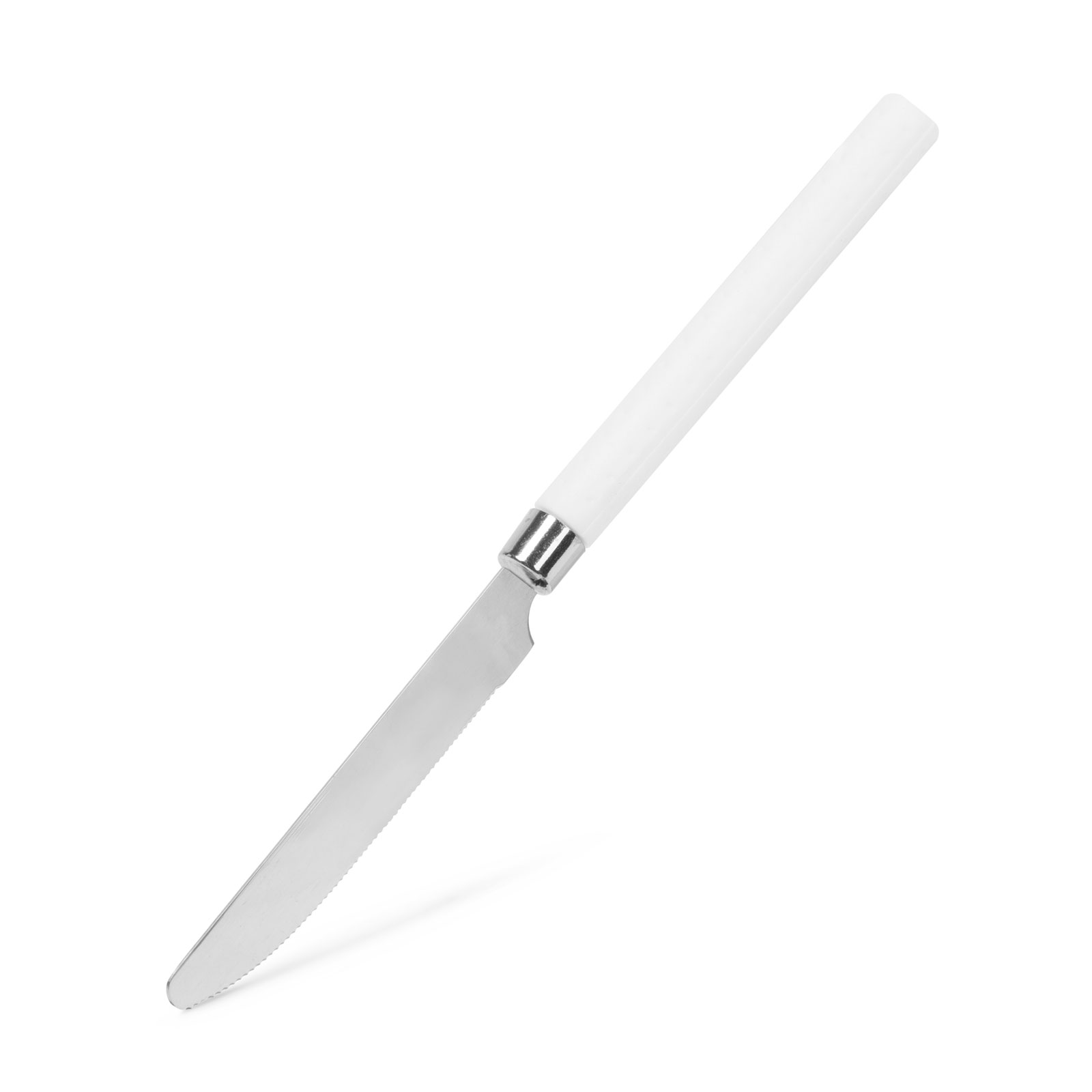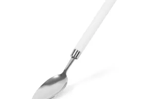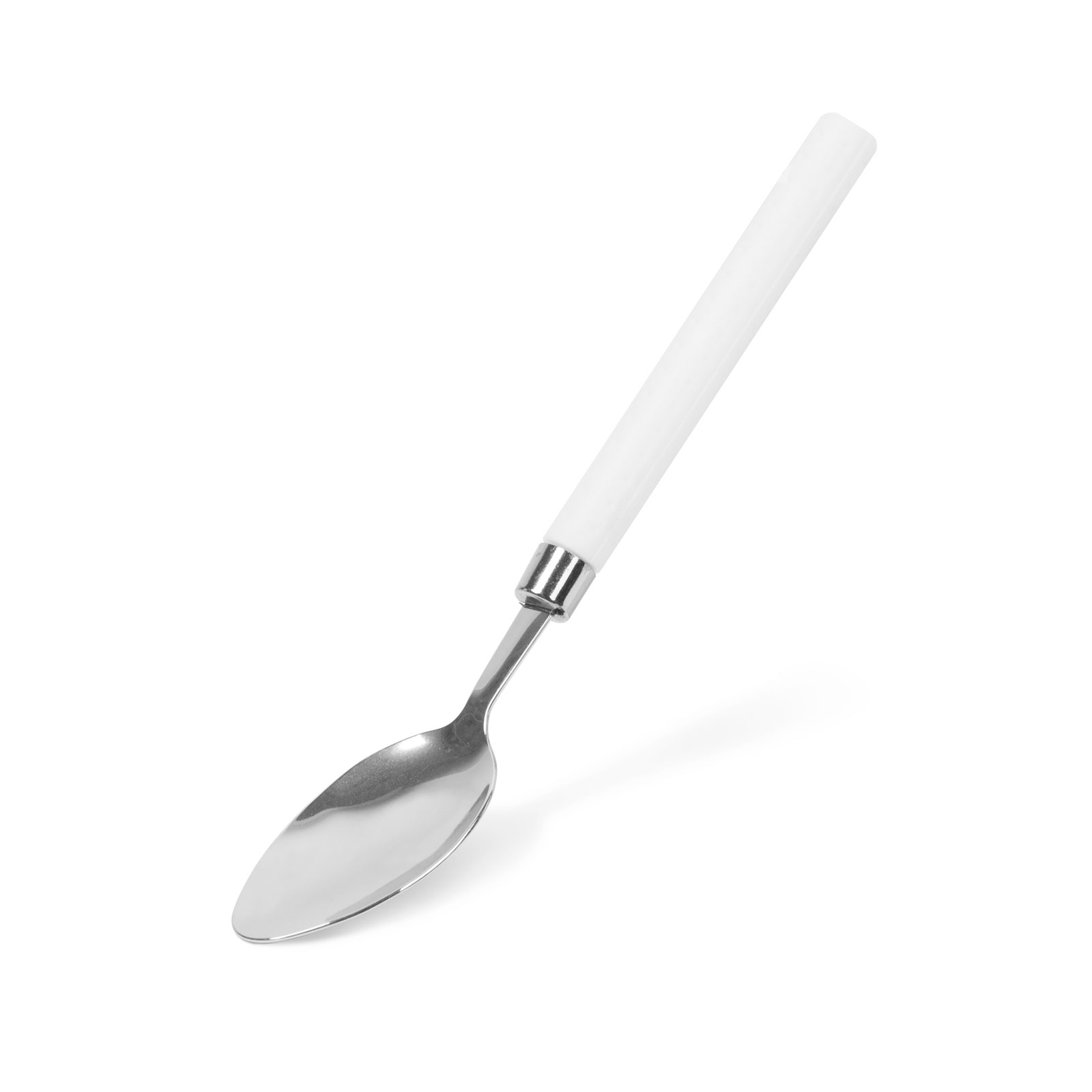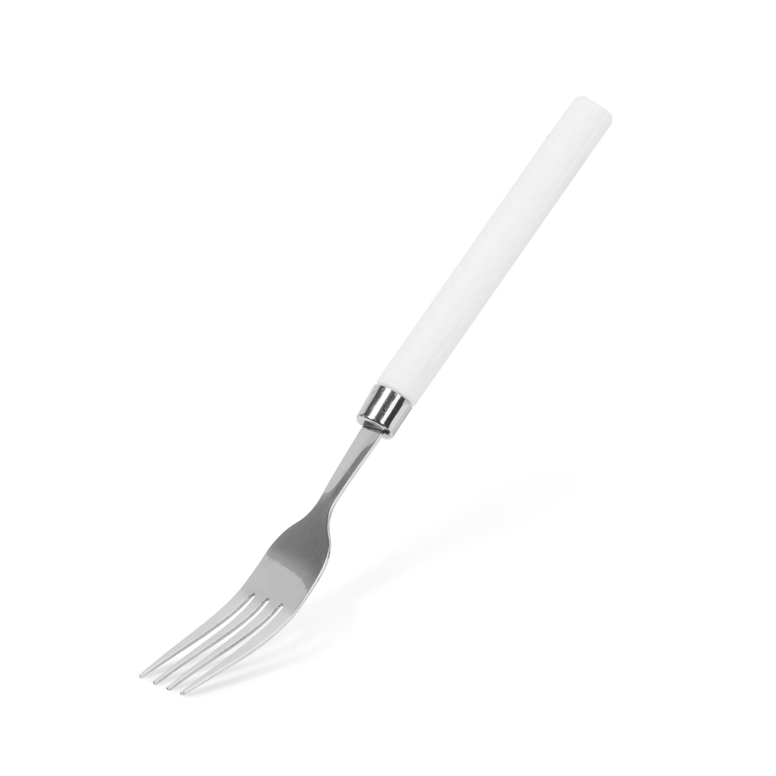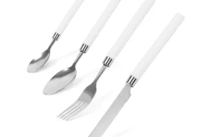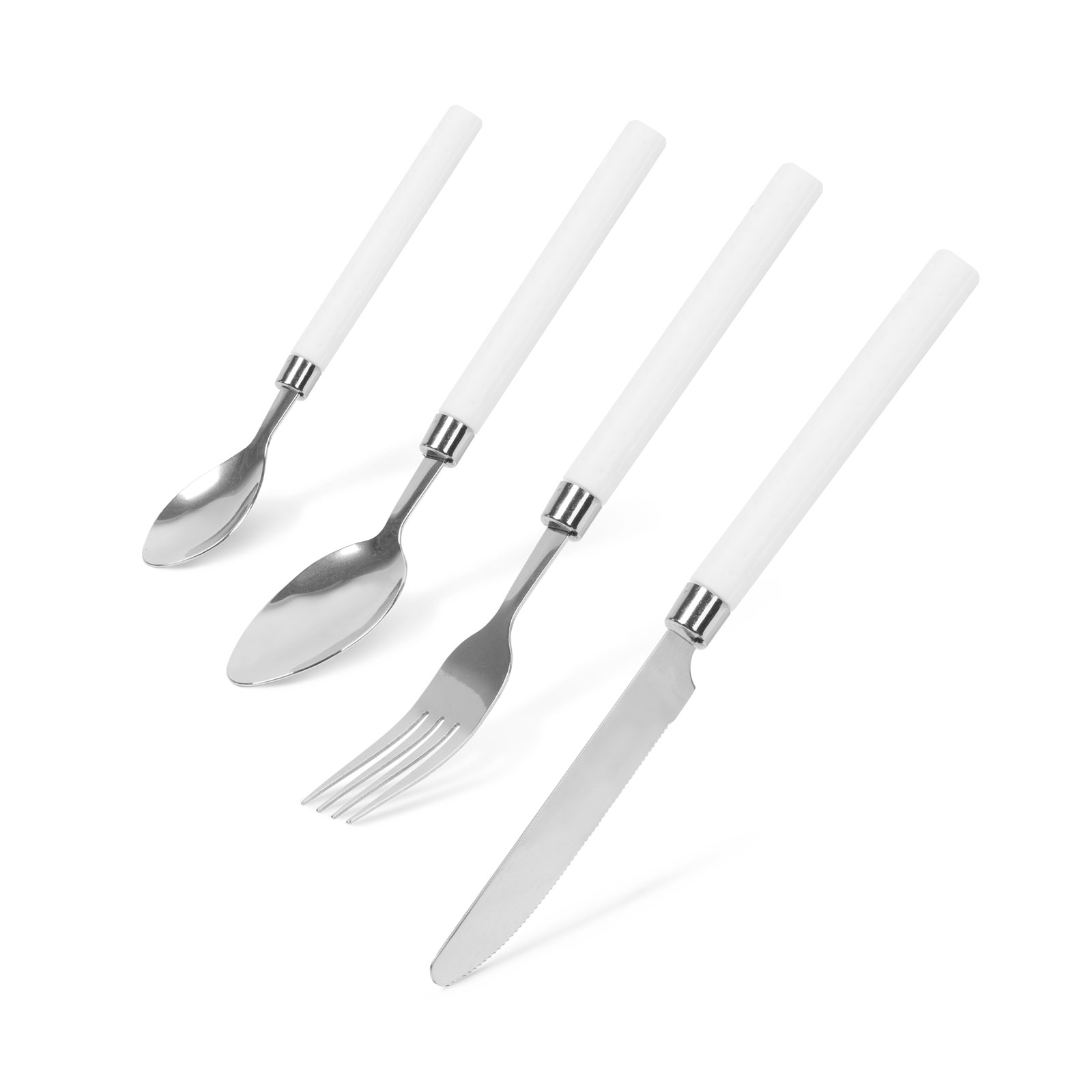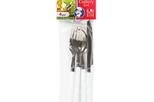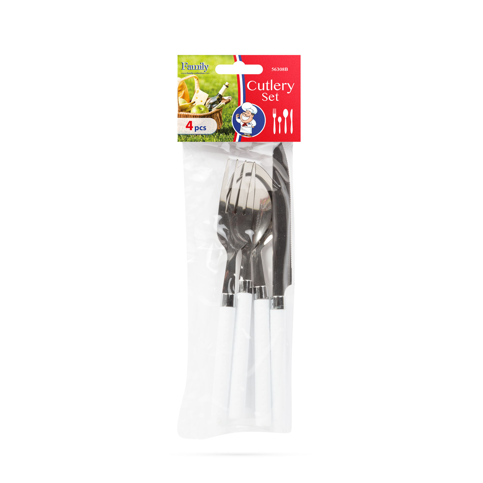 Set de 4 piese tacamuri din inox cu maner solid din material plastic.Maner anti-alunecareOtel inoxidabilSe pot spala in masina de spalat vaseContinutul setului:   1 lingura,1 lingura pentru desert,1 furculita,1 cutitDimensiuni:    182 x 40 x 10 mmCuloare:          albMaterial:         otel inoxidabil / plasticMasa:              ~ 28 g