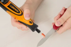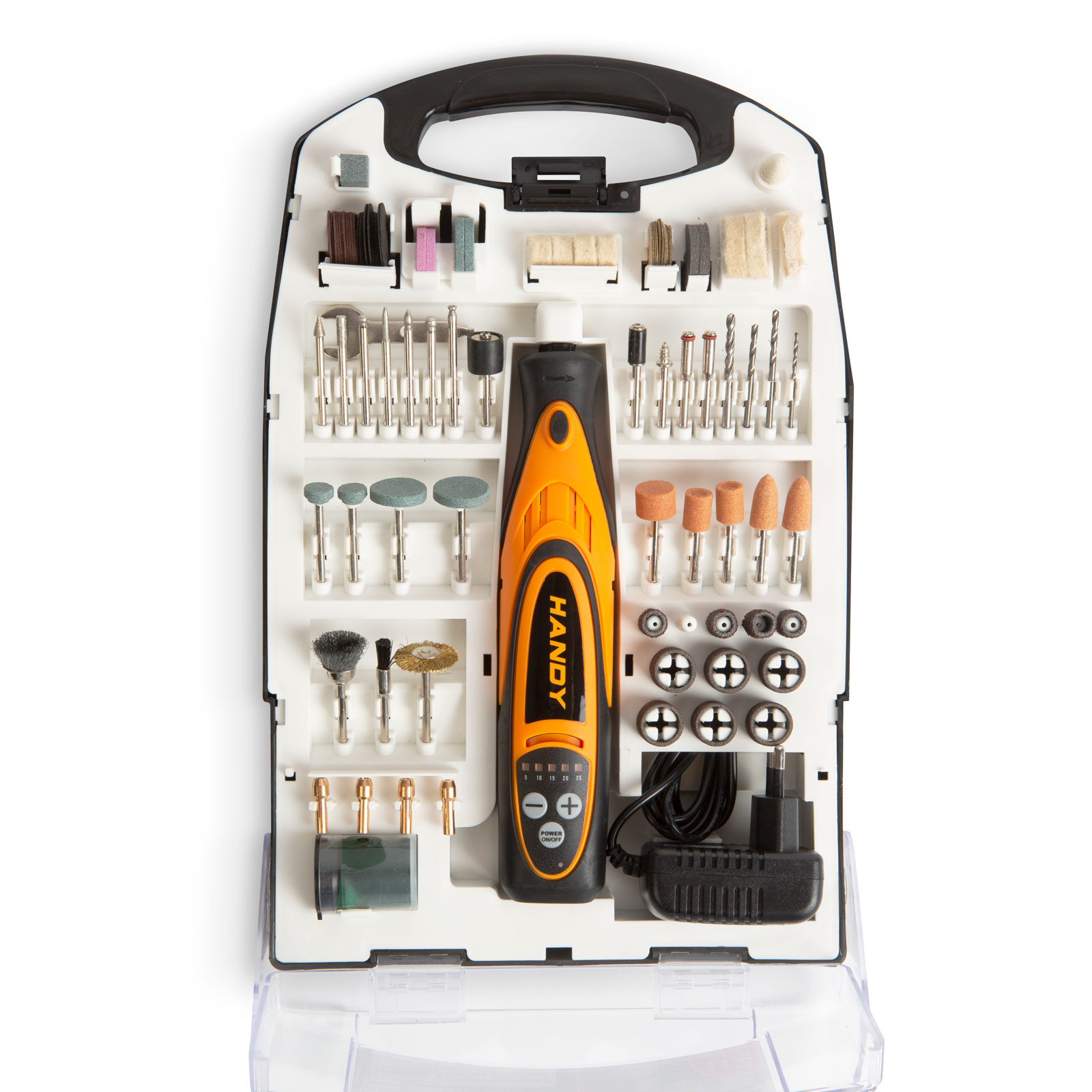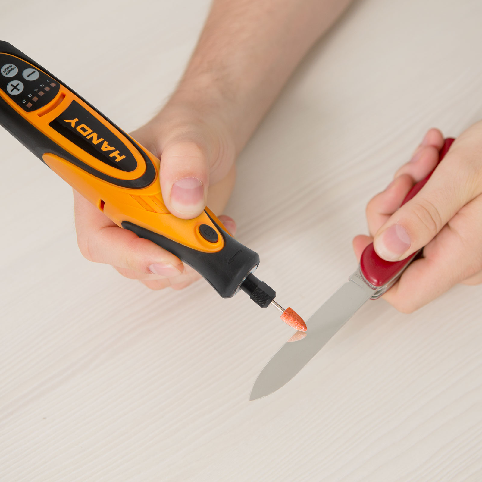 Masina pirogravat, slefuit si gaurit HANDY DRILL.Special dezvoltata pentru orice proiecte artistice, de tamplarie sau bricolaj.Datorita bateriei incorporate, unealta poate fi utilizata fara cabluri. Folosind-o, vei putea sa gauresti, sa lustruiesti, sa gravezi la orice dimensiuni si in locuri greu accesibile.Ideal pentru indepartarea bavurii.Capacitate maxima gaurire O3,2 mm.Diversele accesorii pot fi conectate rapid si fara efort.Datorita dimensiunii sale compacte, unealta este usor de manevrat si poate fi utilizata chiar si pentru lucrul in locuri greu accesibile.Poate fi folosita pentru prelucrarea precisa a lemnului, metalului si plasticului.Functioneaza cu baterie Iluminare LED in zona de lucru LED indicator pentru viteza si capacitatea bateriei Viteza reglabila in 5 nivele Capete usor de inlocuit Gama larga de accesorii intr-o geanta practica  Tensiune de intrare a adaptorului: 100 - 240 V AC, ~ 50/60 HzTensiune de iesire adaptor: 9 V DC, 500 mABaterie: 16340, LI-ION, 7,4 V - 1100 mAhTimp de incarcare: 2 - 3 oreTimp de functionare cu o singura incarcare: pana la 60 de minuteTensiune de operare: 7,4 V DCPutere: 4,5 WConsum de curent: max. 500 mACicluri incarcare baterie: 500Turatie maxima: 5000 - 10000 - 15000 - 20000 - 25000 rpmCapacitate mandrina: 1 - 3,2 mmDiametrul maxim al discurilor de lucru: 35 mmDimensiune: 210 x O40 mmVibratie: 1,55 m/s²Presiune de zgomot: max. 80 dBClasa de protectie la contact: III.Indice de protectie: IP20Lungime cablu: 175 cmCuloare: Portocaliu/NegruGreutate: ~ 250 gMaterial: plasticSetul contine:1 buc- Masina de slefuit1 buc - Cablu de alimentare1 buc - conector de alimentare30 buc - Discuri de taiere4 buc - Discuri abrazive4 buc - Roti de lustruit din fetru20 buc - Roti de slefuit2 buc - Tamburi de cauciuc cu ax2 buc - Discuri de lustruit din fetru1 buc - disc din fetru1 buc - Roata de lustruit textile7 buc - Capete de frezat cu diamant2 buc - roti de slefuit2 buc - Arbori auxiliari1 buc - Arbori auxiliari cu suruburi4 buc - Burghie4 buc - Capete de slefuit din carbura de siliciu5 buc - capete de slefuit din oxid de aluminiu1 buc - Perie din alama1 buc - Perie din nailon1 buc - Perie de otel11 buc - Roti de slefuit4 buc - Insertii de mandrina din cupru1 buc - Cheie1 buc - Pasta de lustruit